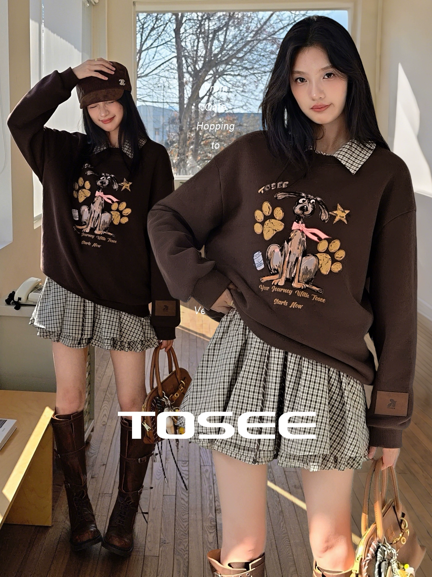 TOSEE 趣味小狗印花圆领卫衣宽松加厚款长袖上衣袖口LOGO皮标设计